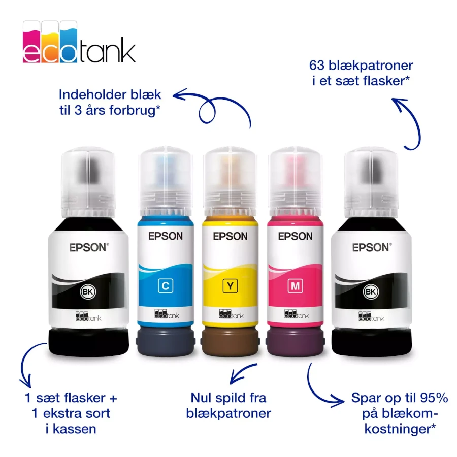 - Blæk: EcoTank genopfyldelige blæktanke (Epson 113-serien CMYK)